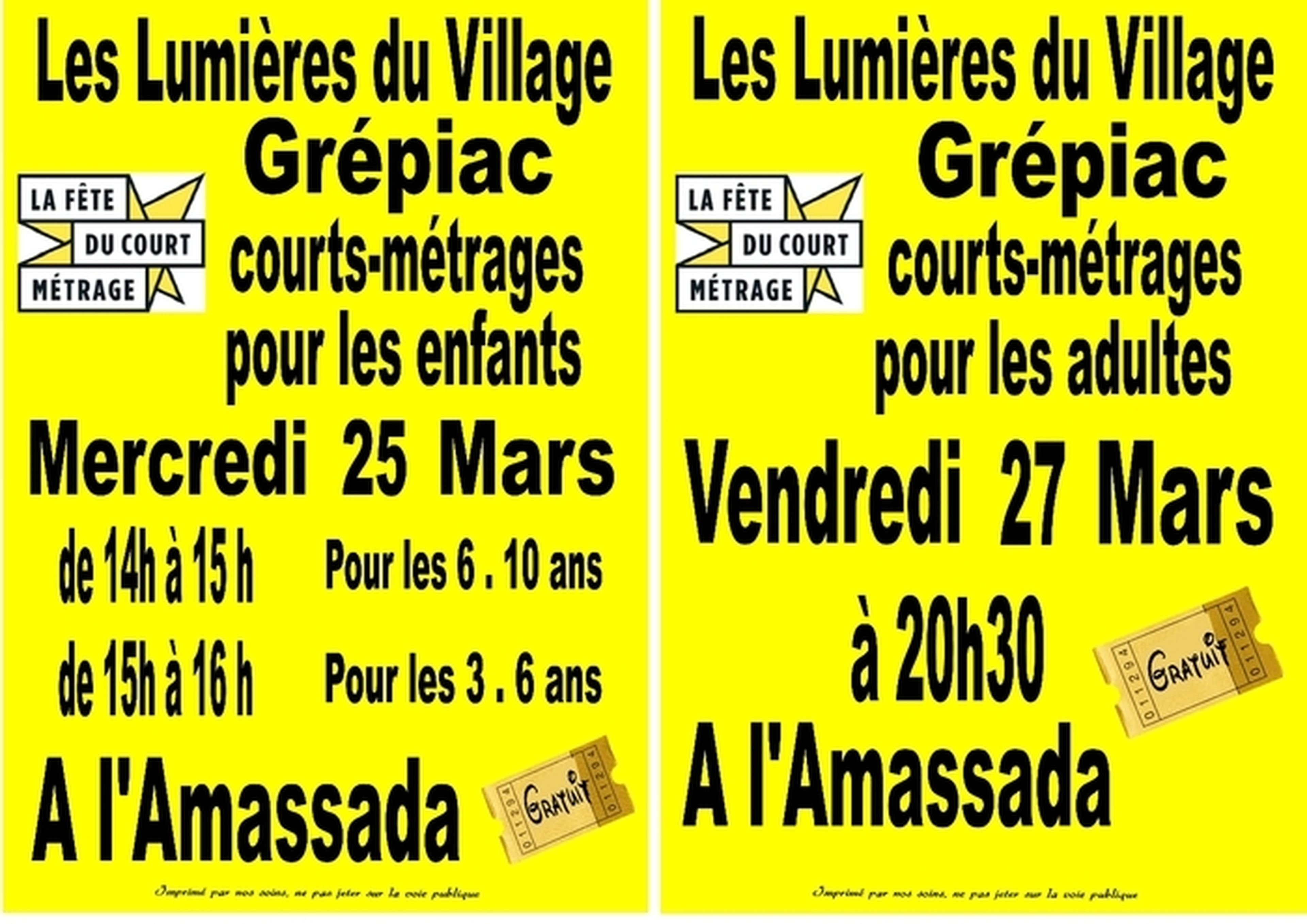 L'association Les lumières du village, à Grépiac, propose des projections de courts métrages, dans le cadre de la Fête du court métrage, pour les enfants mercredi 25 mars l'après-midi et pour les adultes vendredi 27 mars à 20h30.