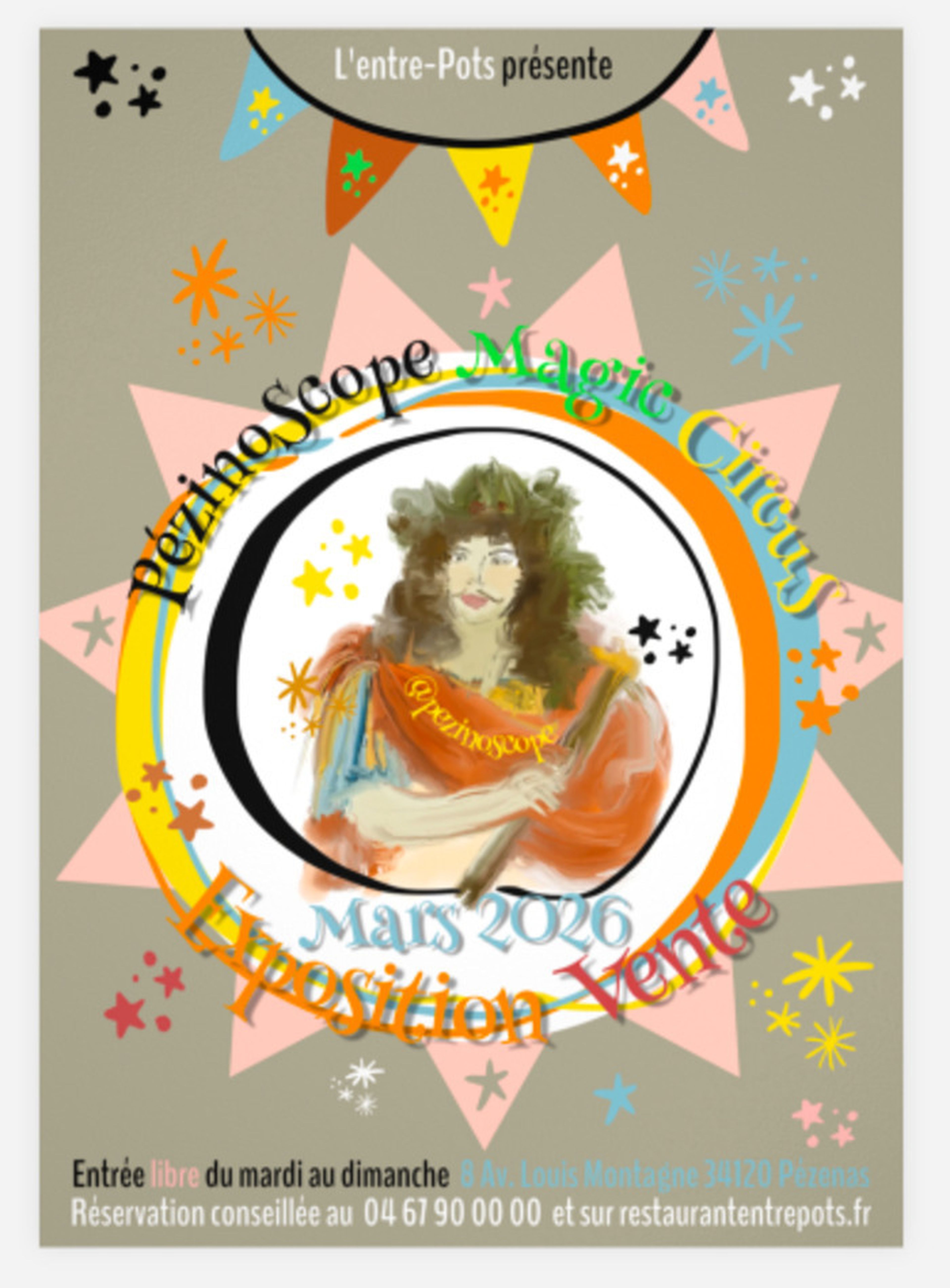 Ode joyeuse à la ville de Molière, la série artistique inédite "PÉZENAS MAGiC CiRCUS" s’expose au cœur d’un magnifique entrepôt piscénois du XIXe siècle devenu restaurant emblématique de Pézenas. Les créations graphiques de cette collection amusante et colorée sont l‘oeuvre d’une plasticienne locale. Hommage à la culture vivante comme au patrimoine de cette cité d’art et d'histoire, elles sont présentées en tirages impérissables (imperméables ou aluminium) exclusifs dans le cadre d’une exposition-vente installée jusqu'à la fin du printemps. Entrée LIBRE et GRATUITE du mardi au dimanche soir︱ L’Entre-Pots - 8 Avenue Louis MONTAGNE - 34120 PÉZENAS ︱Réservations 04.67.90.00.00 ︱Infos exposition et surprises @pezinoscope sur Instagram. Tout public, enfants bienvenus !