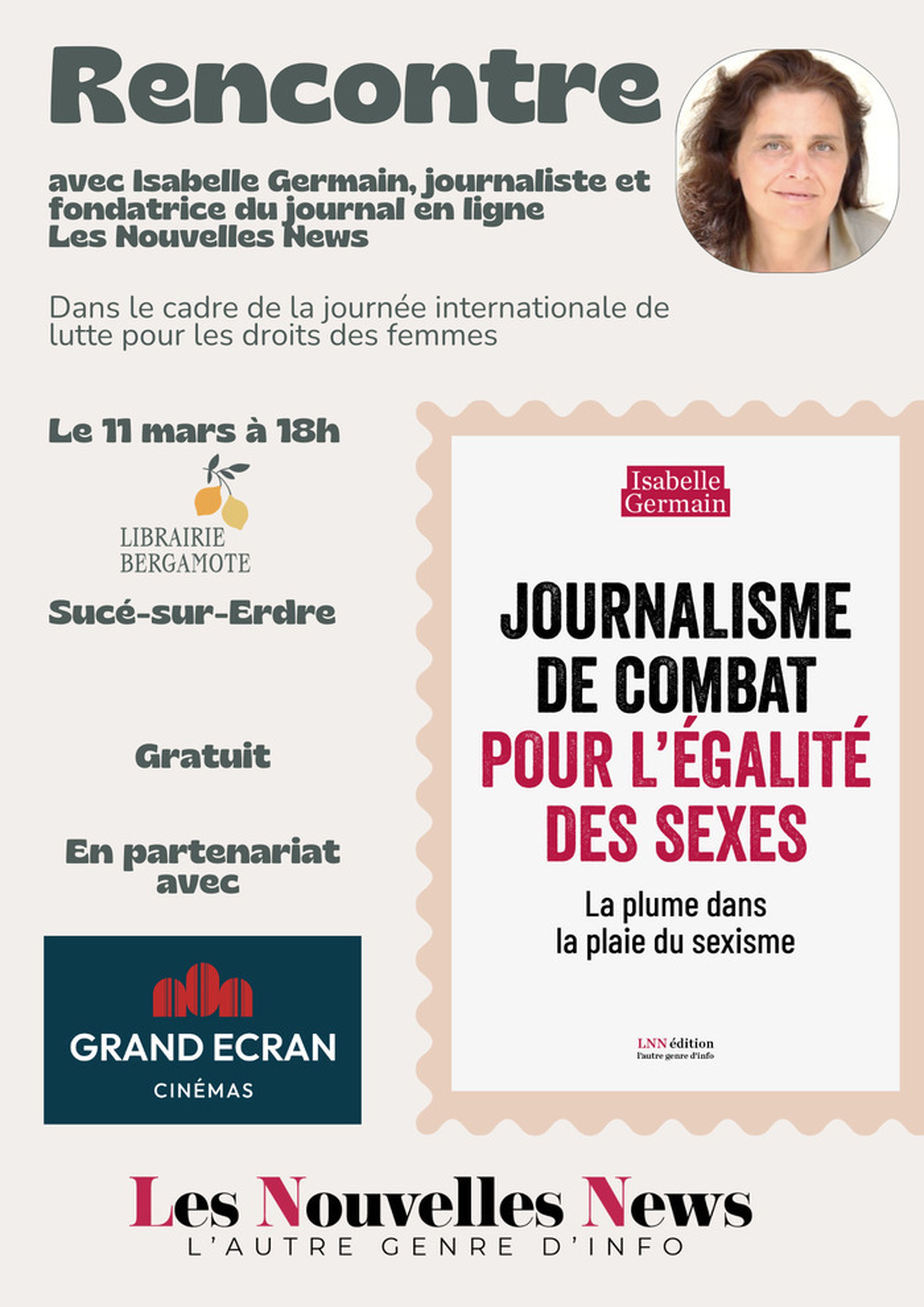 Le cinéma le grand écran de la Chapelle-sur-Erdre organise une rencontre d'Isabelle Germain à la libraire Bergamote à Sucé-sur-Erdre. Cette rencontre sera l'occasion de (re)découvrir son ouvrage : Journalisme de combat pour l’égalité des sexes, La plume dans la plaie du sexisme.
