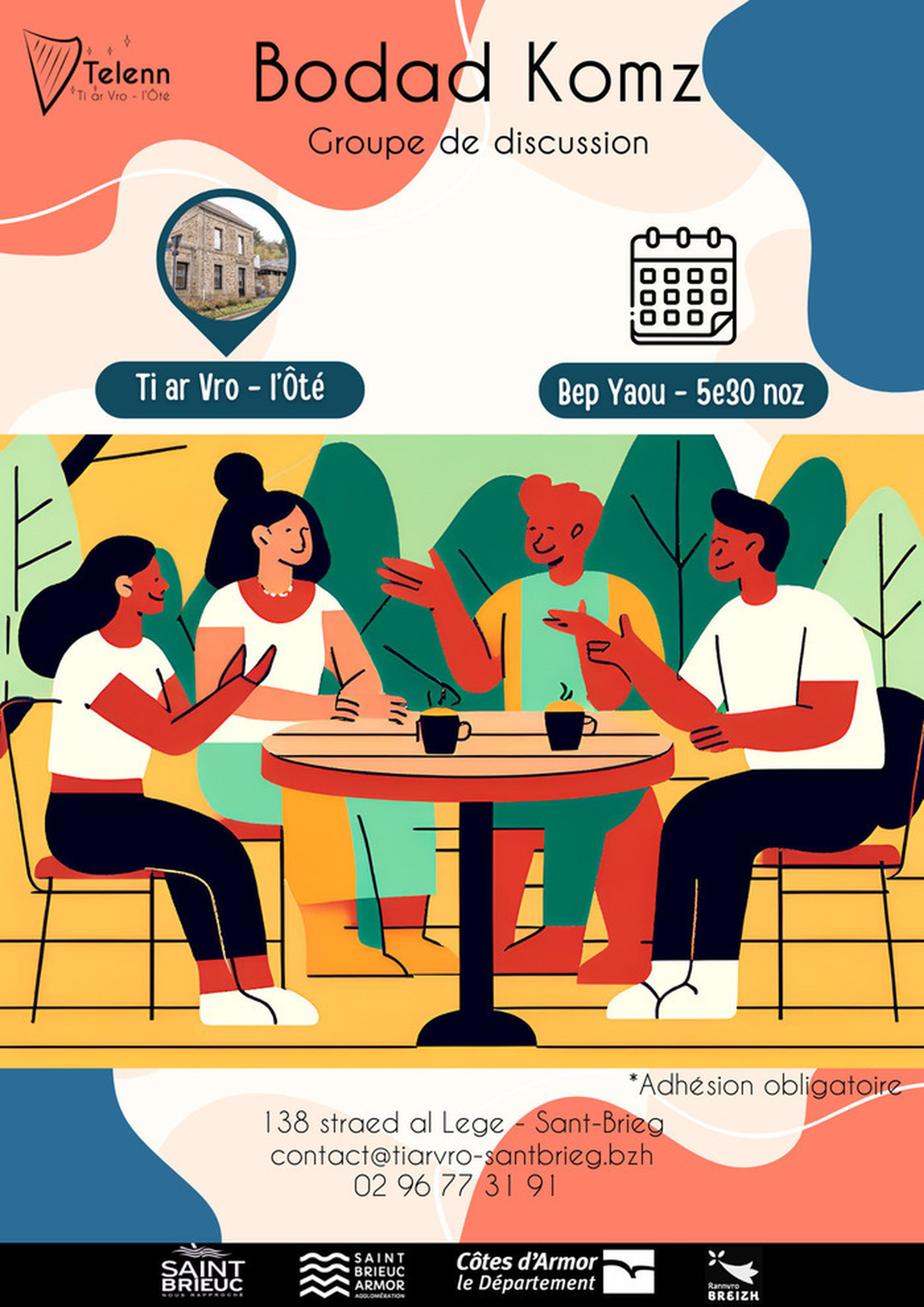 Venez prendre part à cet atelier de discussion pour pratiquer et améliorer votre maîtrise de la langue orale. Cet événement est à destination des bretonnants en apprentissage ou ceux qui ne se sentent pas encore assez à l'aise à l'oral pour tenir des discussions en breton penn da benn. Rendez-vous donc au Ti ar Vro - l'Ôté de Saint-Brieuc chaque jeudi à 17h30 pour échanger en breton. Ces rendez-vous sont gratuits toute l'année pour celles et ceux qui ont adhéré à l'association.