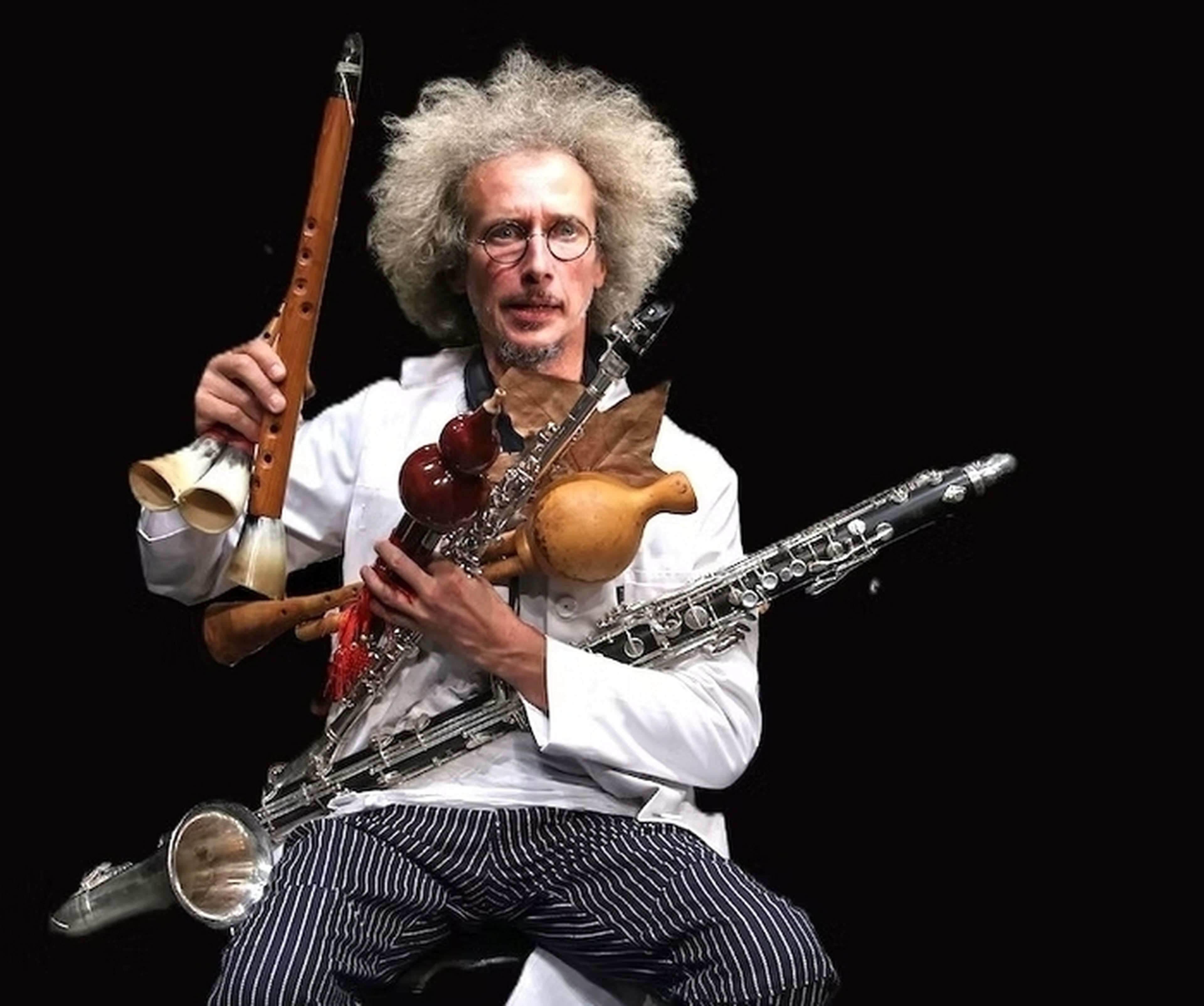 Il a dans ses bagages, des tableaux, des portraits de famille et une myriade d’instruments qui étayent sa démonstration. De la feuille de Cromagnon au sylphyo (clarinette électronique) en passant par le cor de basset de Mozart, il débale et joue le mijwiz syrien, le hulusi chinois, la birbynè, le pakou, la clarinette basse et bien d’autres...De la Méditerranée à la Chine, de la vieille Europe et de l’Amérique à l'ESPACE !