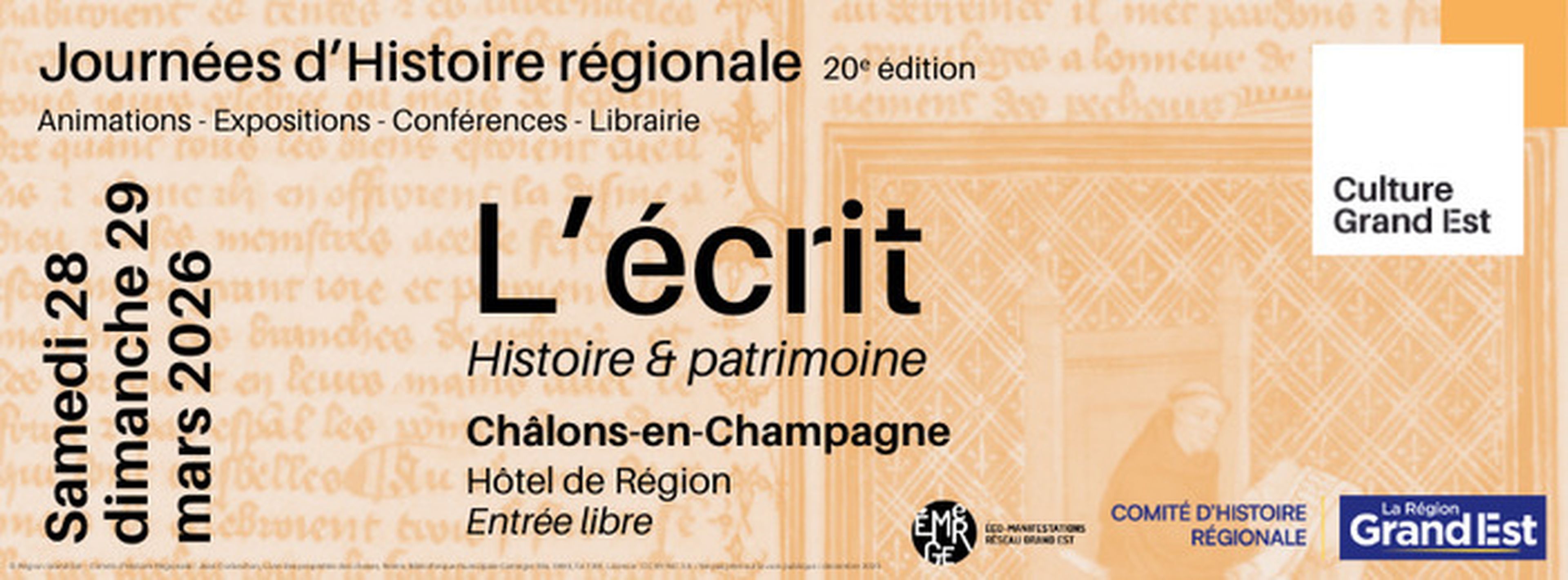 Les Journées d’Histoire Régionale se dérouleront les samedi 28 et dimanche 29 mars 2026 à l’Hôtel de Région de Châlons-en-Champagne, autour du thème de l’écrit.