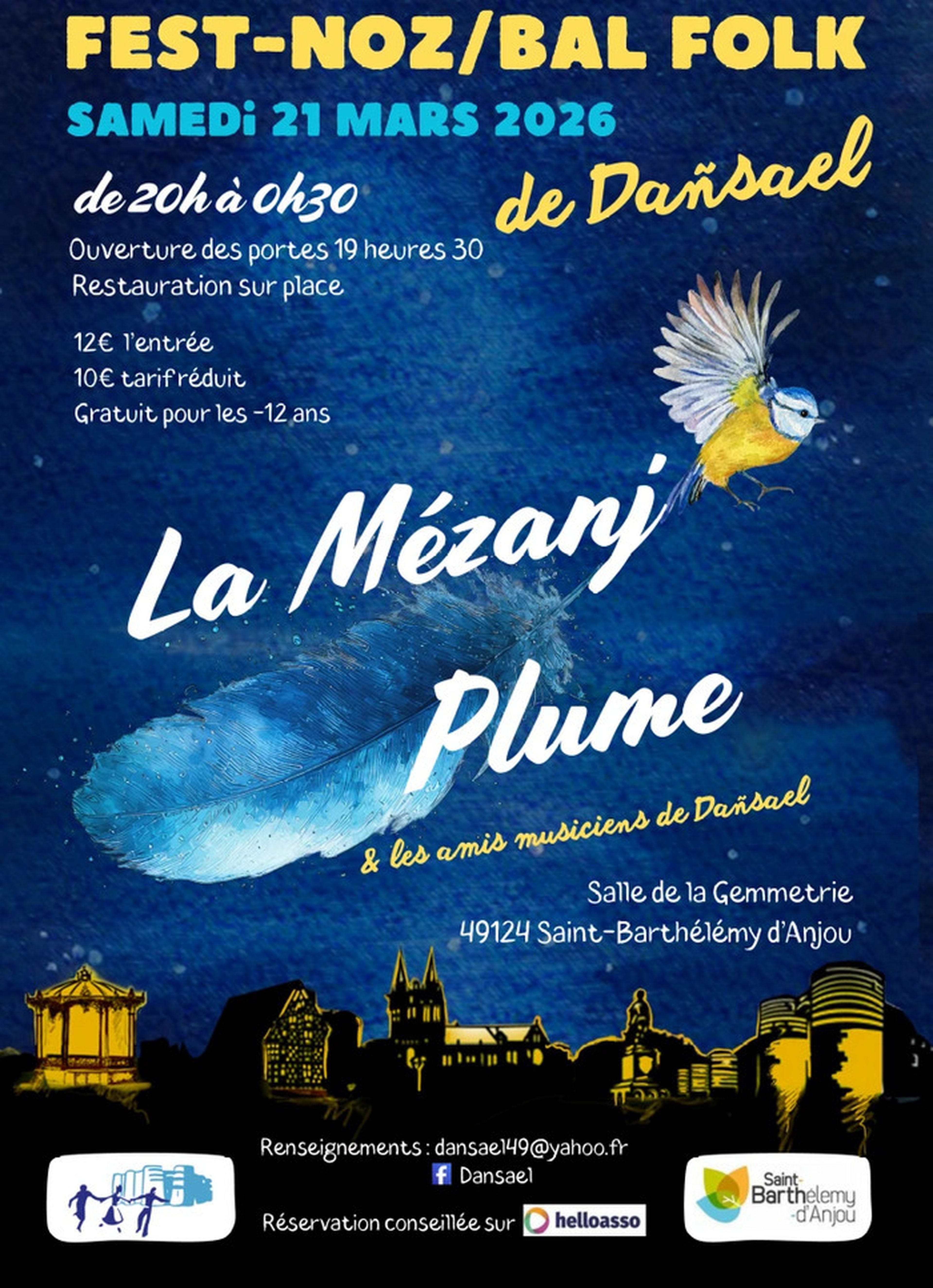 Le 21 mars 2026, comme chaque année, l’association Dañsael organise son grand Fest-noz / Bal Folk. Deux groupes vous feront danser : La Mézanj’ et Plume.
