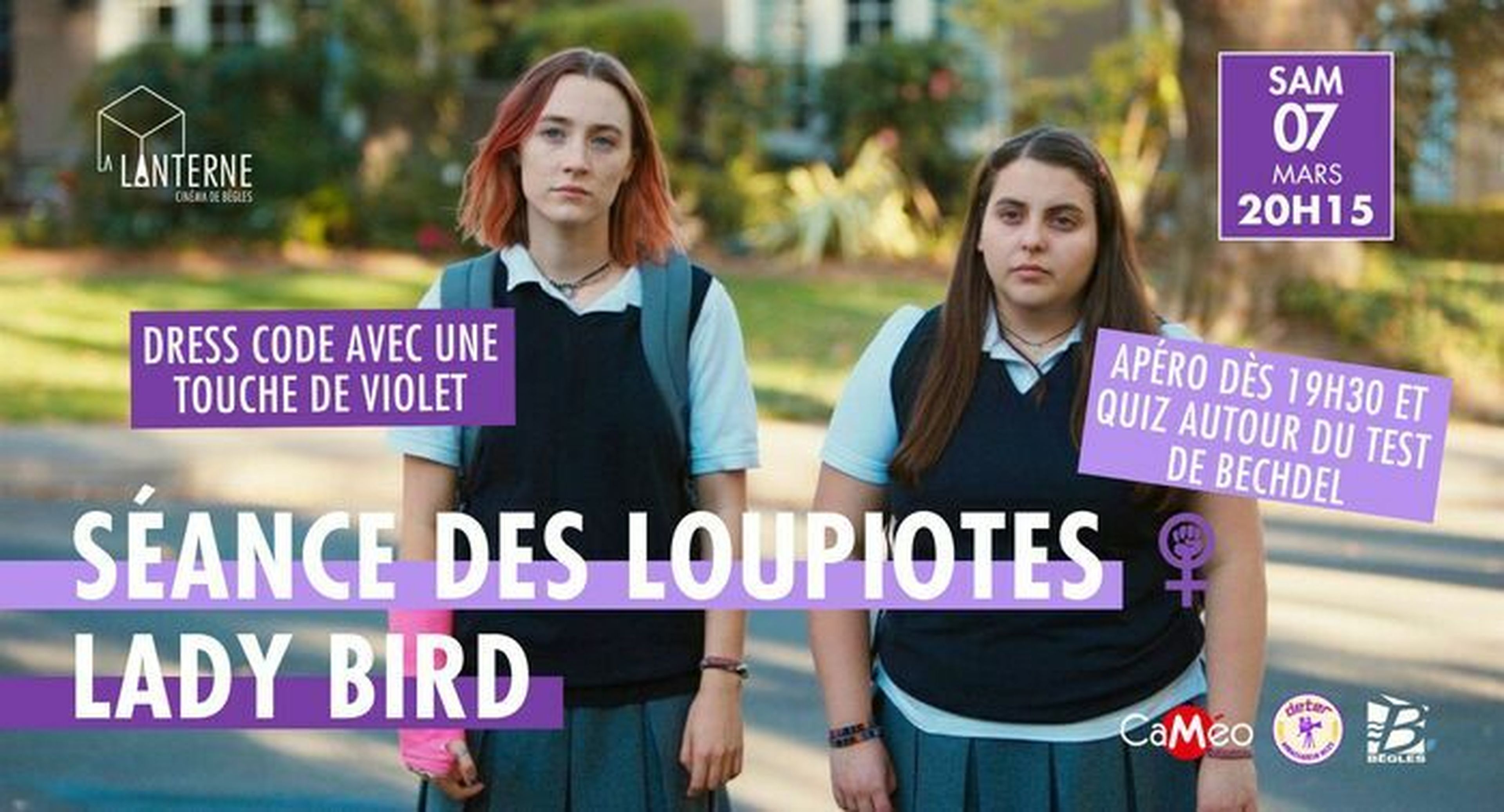 Séance animée par le groupe des jeunes ambassadeurs de la Lanterne. Accueil à 19h30 autour d’un apéro violet, quiz autour du test de Bechdel à 20h15 en salle, pour échanger sur la représentation des femmes au cinéma, film en suivant. Dress code violet : venez avec un accessoire ou en total look de la couleur symbole de la lutte pour les droits des femmes.