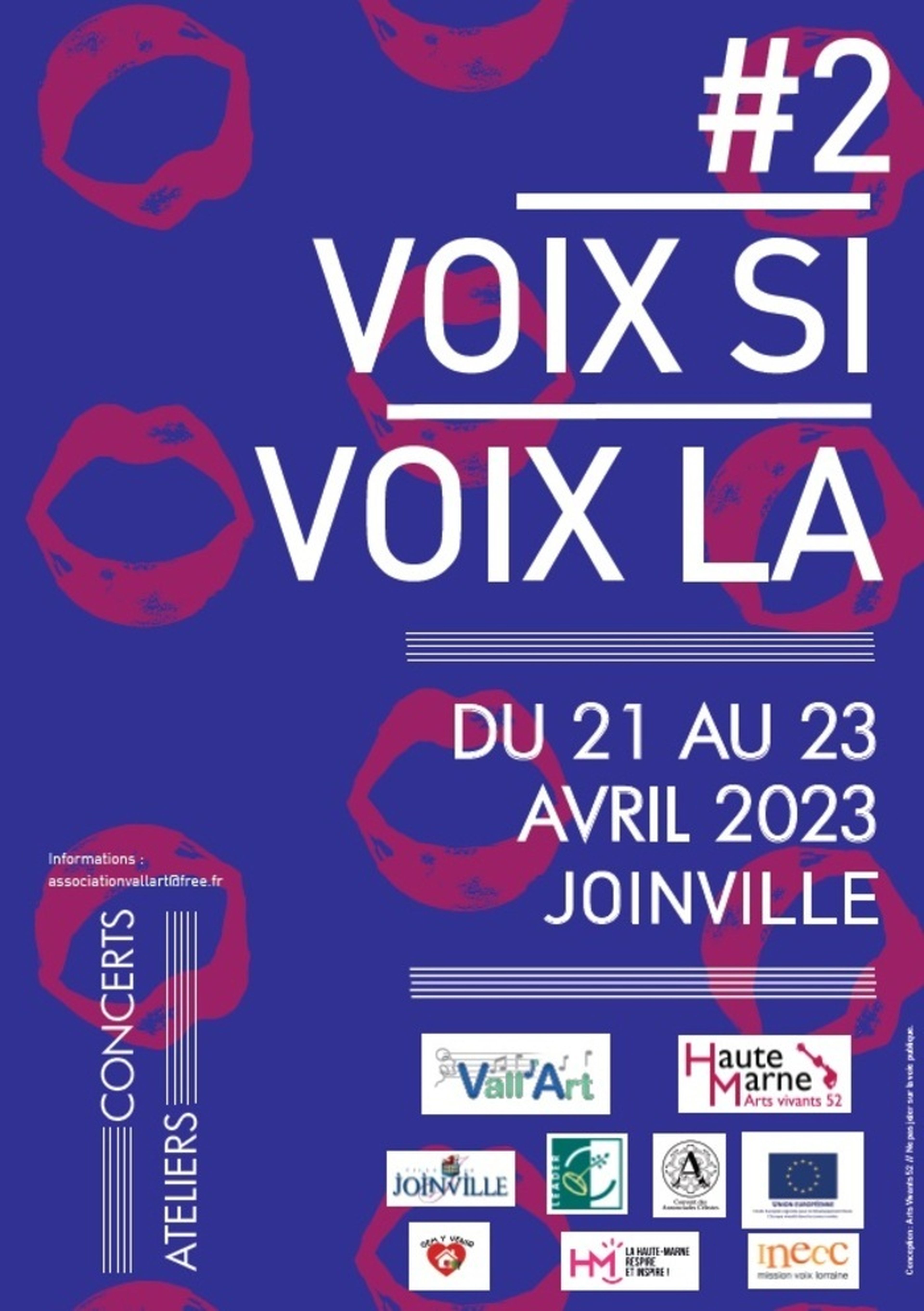 Festival "Voix Si, Voix La" #2 : 21, 22 et 23 avril 2023 à Joinville Trois jours de festival autour de la voix : concerts (chœur d'enfants de Vall'Art, groupes VoxpoP et ExeKo, des chœurs joinvillois et haut-marnais), ateliers artistiques animés par des professionnels.
