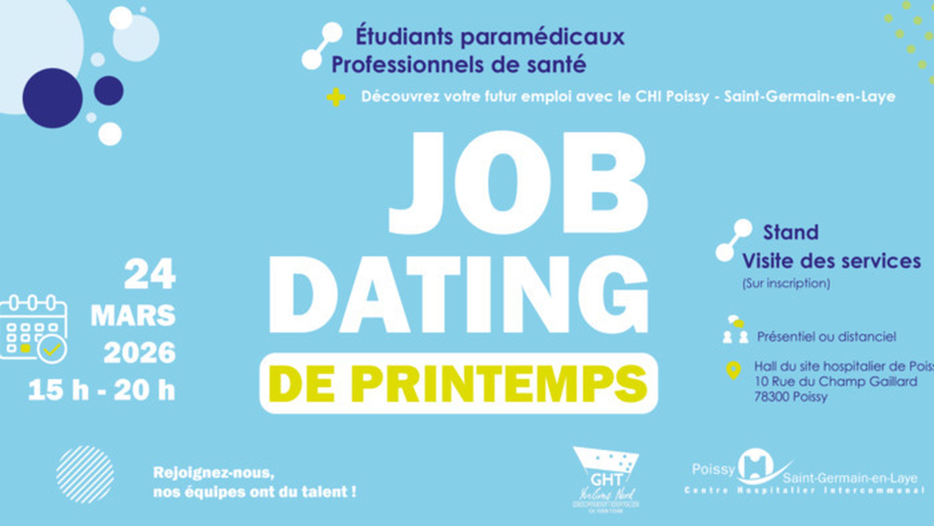 Nous vous convions à notre job dating de printemps le 24 mars de 15h à 20h en présentiel ou distanciel sur le site hospitalier de Poissy. Etudiant, personnel soignant, médicotechnique ou socio éducatif venez rencontrer nos recruteurs et professionnels.
