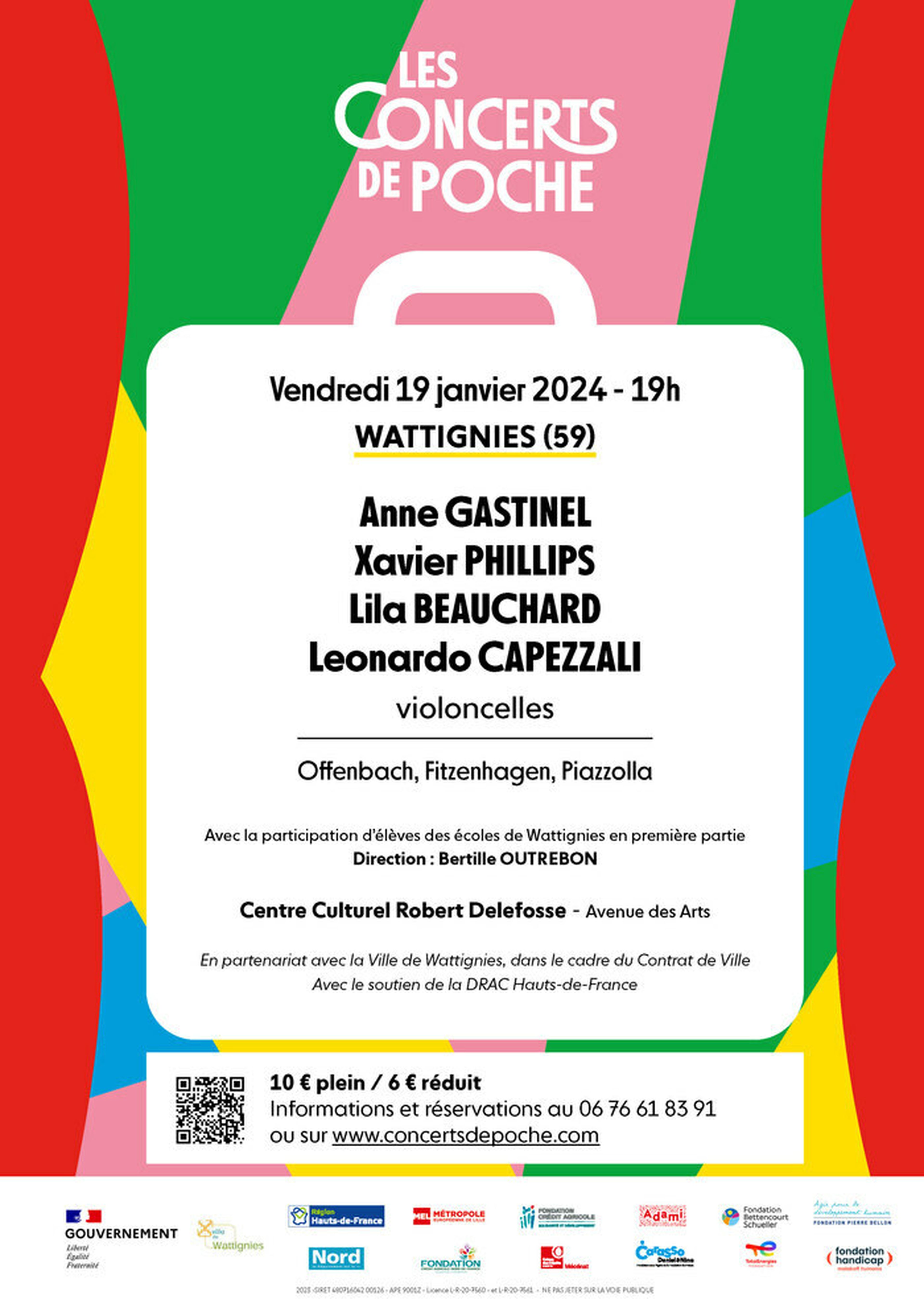 Anne GASTINEL, violoncelle Xavier PHILLIPS, violoncelle Lila BEAUCHARD, violoncelle Leonardo CAPEZZALI, violoncelle Anne Gastinel et Xavier Philips deux violoncellistes très renommés et exceptionnellement chaleureux, entrainent sur leurs pas deux jeunes talents passionnés, Lila Beauchard et Leonardo Capezalli. Ces virtuoses partagent tous les quatre la scène dans un esprit de compagnonnage à la fois convivial et exigeant. Ils offrent un répertoire varié de transcriptions et d’œuvres originales pour quatre violoncelles, pour un concert puissant et joyeux, extrêmement vivant, et nous emmènent dans l’univers drôle et romantique d’Offenbach. Programme Offenbach, Fitzenhagen, Piazzolla Une première partie sera assurée par les enfants des écoles Bracke-Desrousseaux et collège Jean Moulin de Wattignies qui ont suivi des ateliers de chant choral hebdomadaires avec la cheffe de chœur Bertille Outrebon. Les participants interprètent le répertoire joué lors du concert et en assurent la première partie, accompagnés par les concertistes. Réservation En ligne sur le site de concert de poche en cliquant sur « Réserver » https://www.concertsdepoche.com/france/concerts/reservation/a23-wattignies-19012024 ou par téléphone au 06 76 61 83 91 10 € plein tarif / 6 € tarif réduit