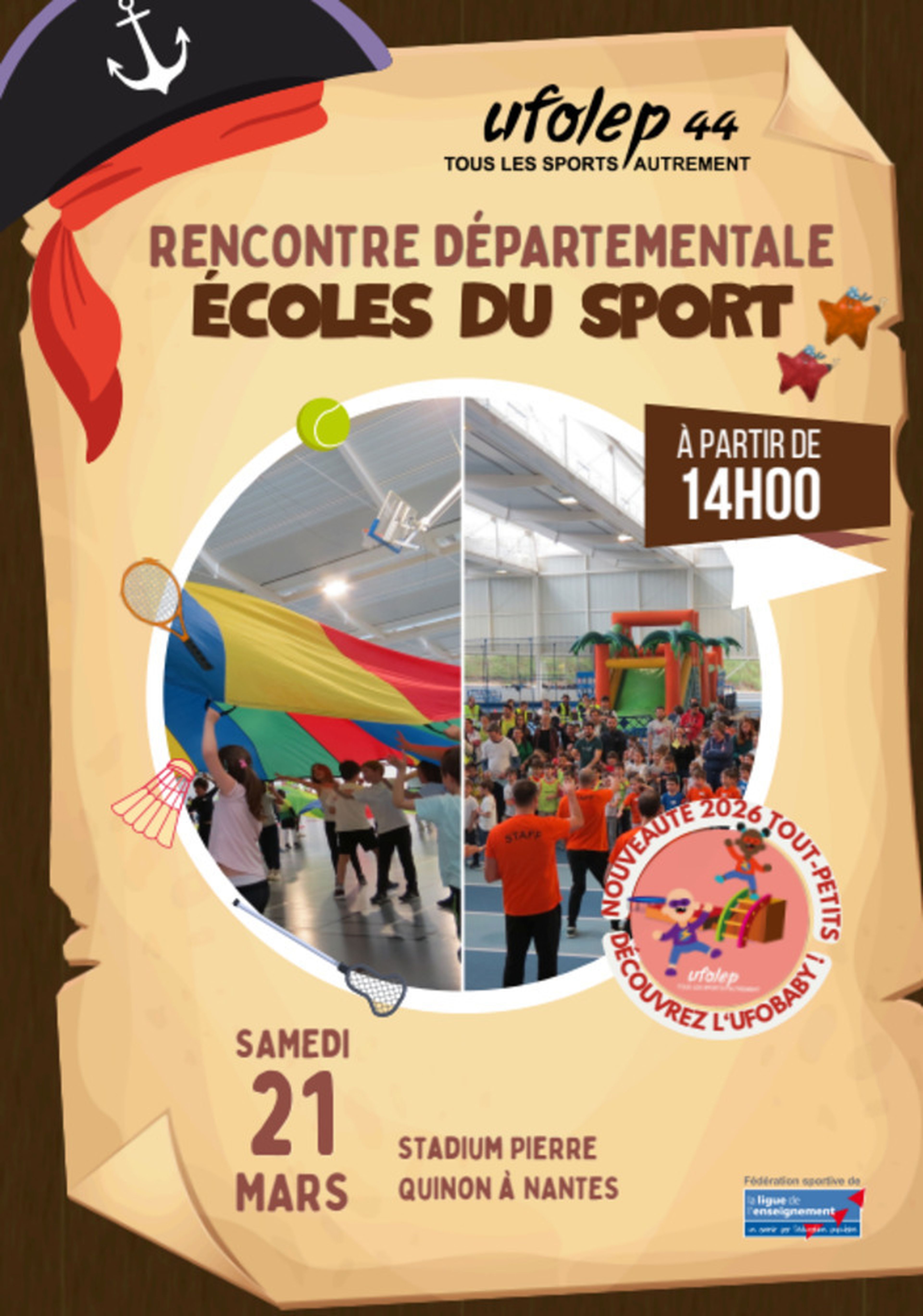 Dans le cadre du développement des Ecoles du Sport, l’UFOLEP 44 organise sa Rencontre Départementale des Ecoles du Sport, le samedi 21 mars 2026 de 14h à 17h au stadium Pierre Quinon à Nantes
