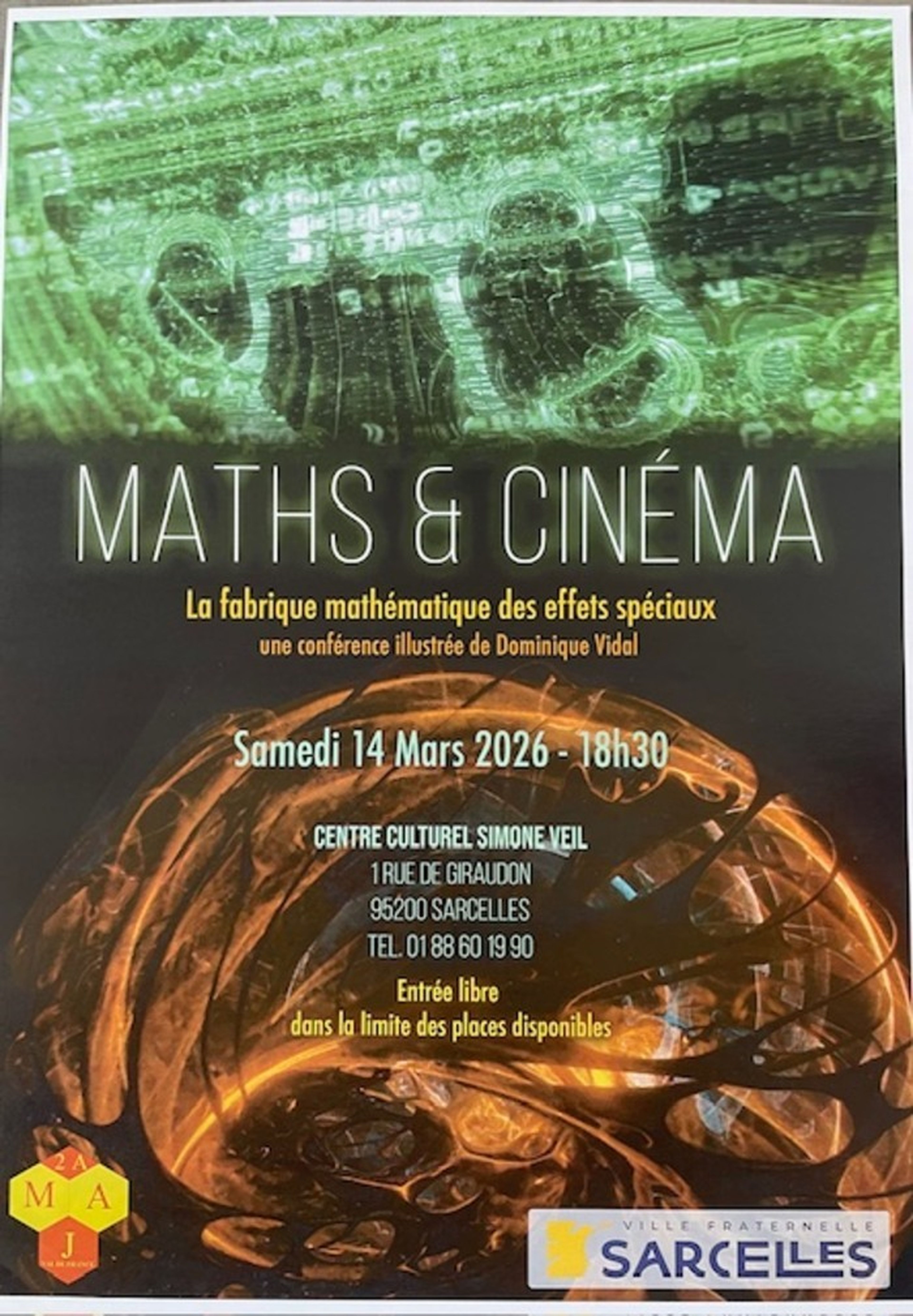 L'association 2AMAJ propose pour la semaine des mathématiques une conférence le samedi 14 mars à 18h30 à l'auditorium de centre culturel Simone Veil en entrée libre ainsi qu’une exposition et des ateliers ayant pour thème "la numération à travers les âges et les civilisations" en entrée libre également du lundi au samedi de 9h à 12h et de 14h à 18h toujours au centre culturel Simone Veil. Ouverture à partir du samedi 14 mars 2026. Information au 01 88 60 19 90